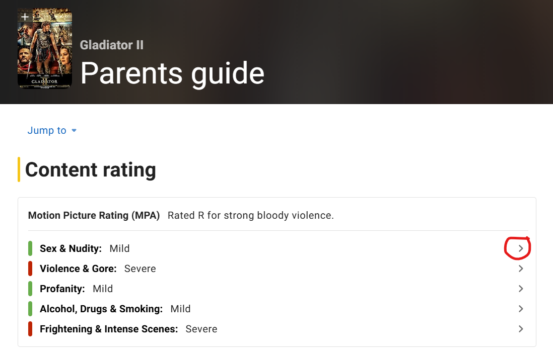 On the Internet you need to click on the rating. This will take you to the parents guide. Click the arrow to view a list of any sex and nudity there maybe.