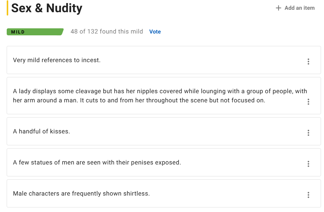 It’s like a food labeling system which tells you what a food item contains. That’s it. We make no judgments about what is good or bad — or anything else. Indeed, we do not “condemn,” “critique” or “criticize” movies. And we don’t “praise” or “recommend” movies either. We advance no “beliefs” and we do not “preach” anything. We are not affiliated with any political party, any cultural or religious group, or any ideology.